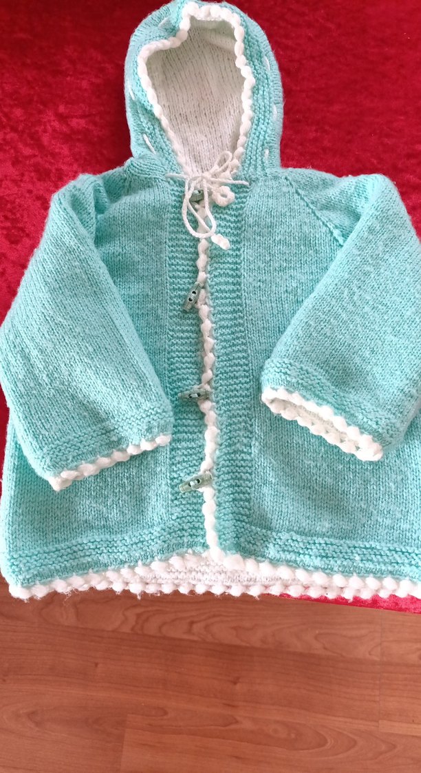 Turkuaz renkli, örgü kız çocuk hırka, bol kesim ve uzun kolludur. Beyaz süslemeli kapüşonlu iki yüzlüde giyilebilir.El örgüsü