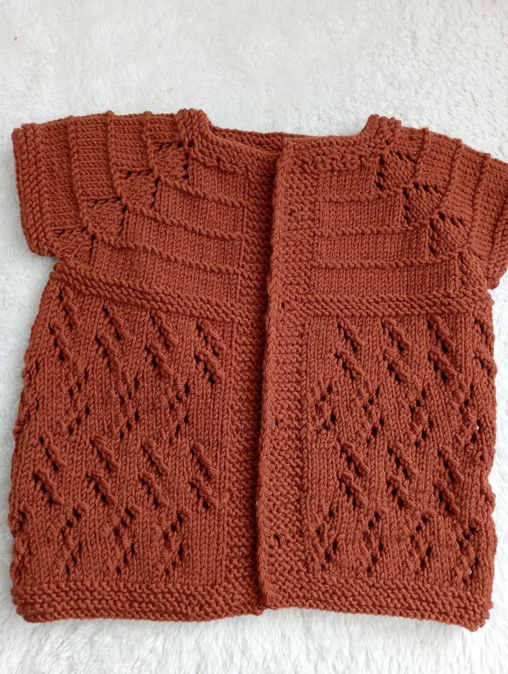 Koyu kahverengi örgü kız-erkej çocuk hırkası, bol kesim ve kısa kollu. Bohem tarzda, yumuşak Koton iple örülmüştür 6-9 ay için uygundur