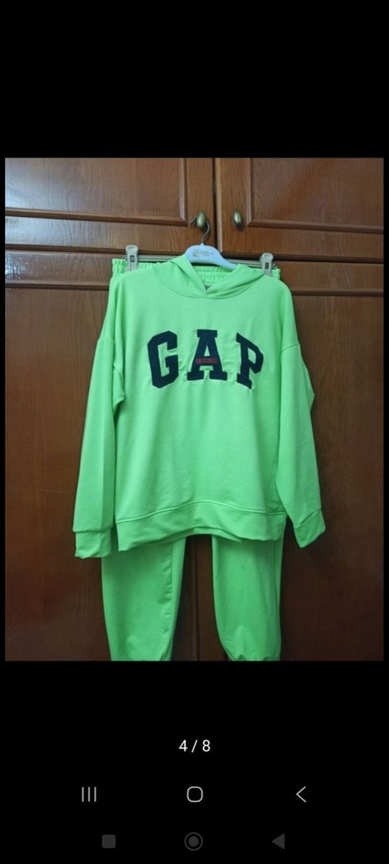 bol kesim, uzun kollu ve bisiklet yaka yeşil eşofman takımı. Yumuşak kumaş ve önünde renkli GAP baskısı bulunur.
