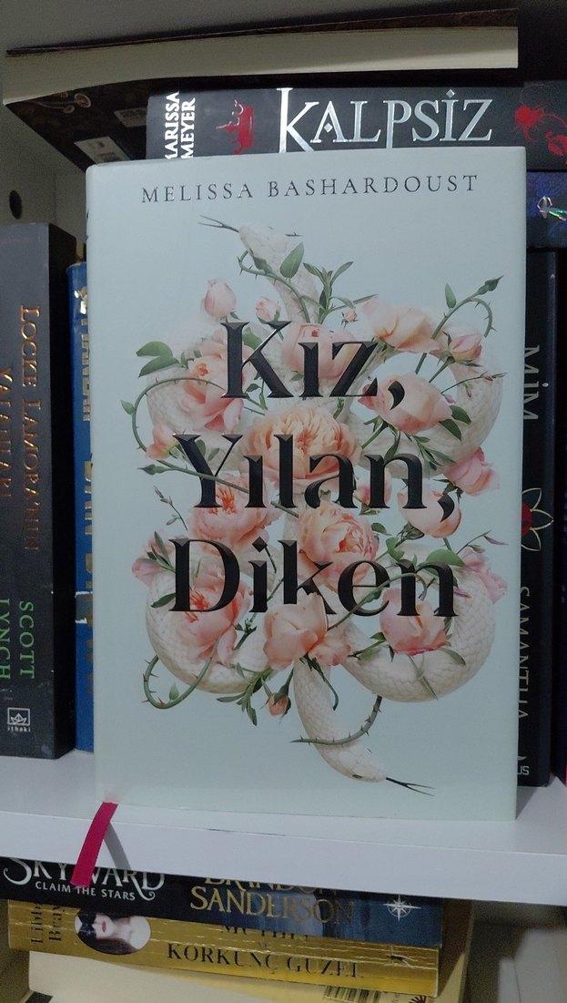 Melissa Bashardoust'un "Kız, Yılan, Diken" adlı romanı, beyaz yılan ve pembe çiçeklerin yer aldığı kapak tasarımıyla dikkat çekiyor. Temizdir bir kere okunmuştur.