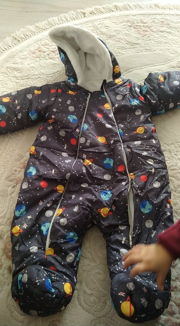 Fermuarlı ve renkli uzay temalı desenli, yumuşak ve sıcak kumaşlı bebek tulumu. Soğuk havalar için uygun, rahat ve koruyucu sokak stili.bir kaç ay kullanıldı cok temiz iki adet var elimde