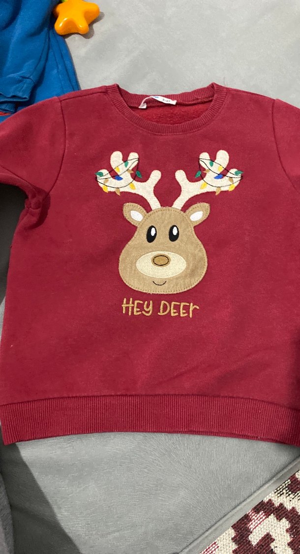 Kırmızı sweatshirtta geyik baskısı ve kürklü detaylar bulunur. Yuvarlak yaka, uzun kollu ve dar kesimdir. 'HEY DEER' yazısı mevcuttur.