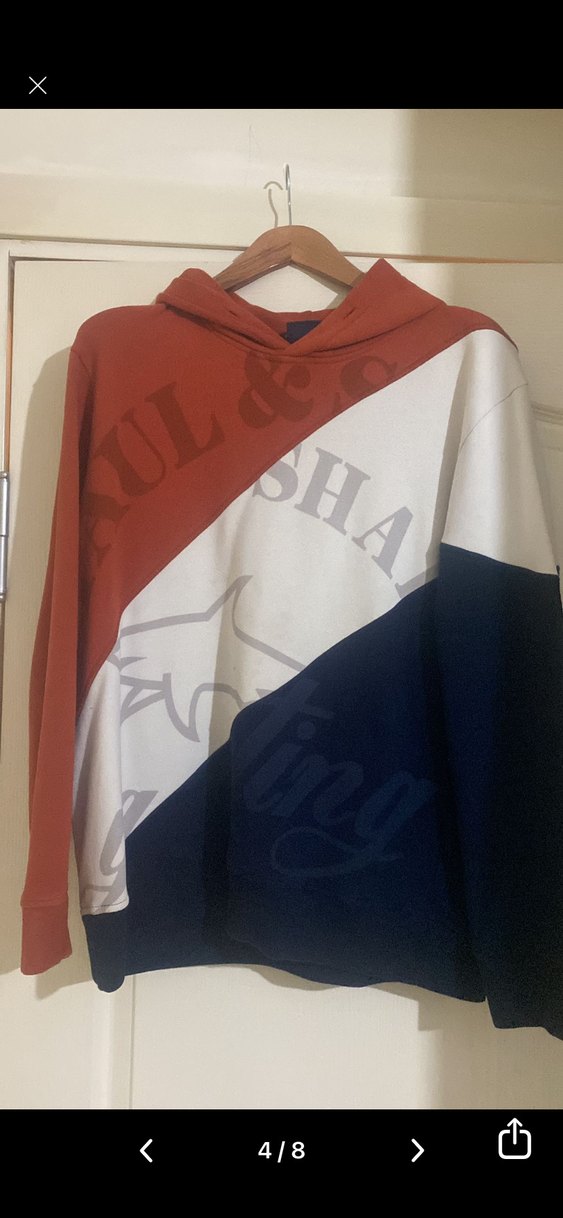 Uzun kollu, kapüşonlu ve bol kesim erkek sweatshirt. Koyu kırmızı, beyaz ve lacivert renk bloklu, baskılı ve drapeli tasarım. Yumuşak ve sıcak kumaştan üretilmiştir.