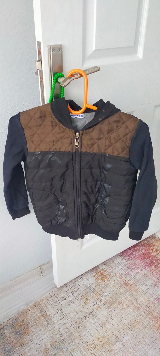 Fermuarlı ve kapüşonlu, koyu kahverengi ve siyah renklerde, yumuşak ve sıcak dokulu, düz desenli, sokak tarzı erkek çocuk montu. koltuk alti 40 boy 45 cep oc astarlari sökük.birde yakadaki leke.kullanima engel degil