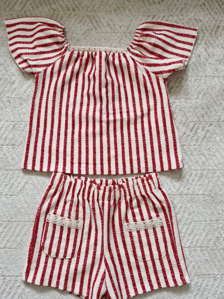 Kız çocuk için kısa kollu, fırfırlı detaylı, kırmızı beyaz çizgili renkli takım. Şortlarda küçük ön cepler bulunur. Kumaşı yumuşak rahat bir takım