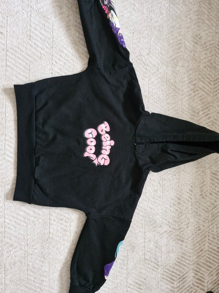 Bu siyah kız sweatshirtü kapüşonlu, uzun kollu #crop Yumuşak kumaştan yapılmış, baskılı desenlere sahiptir. Trendy casual tarz için uygundur. #lcw #sweatshirt