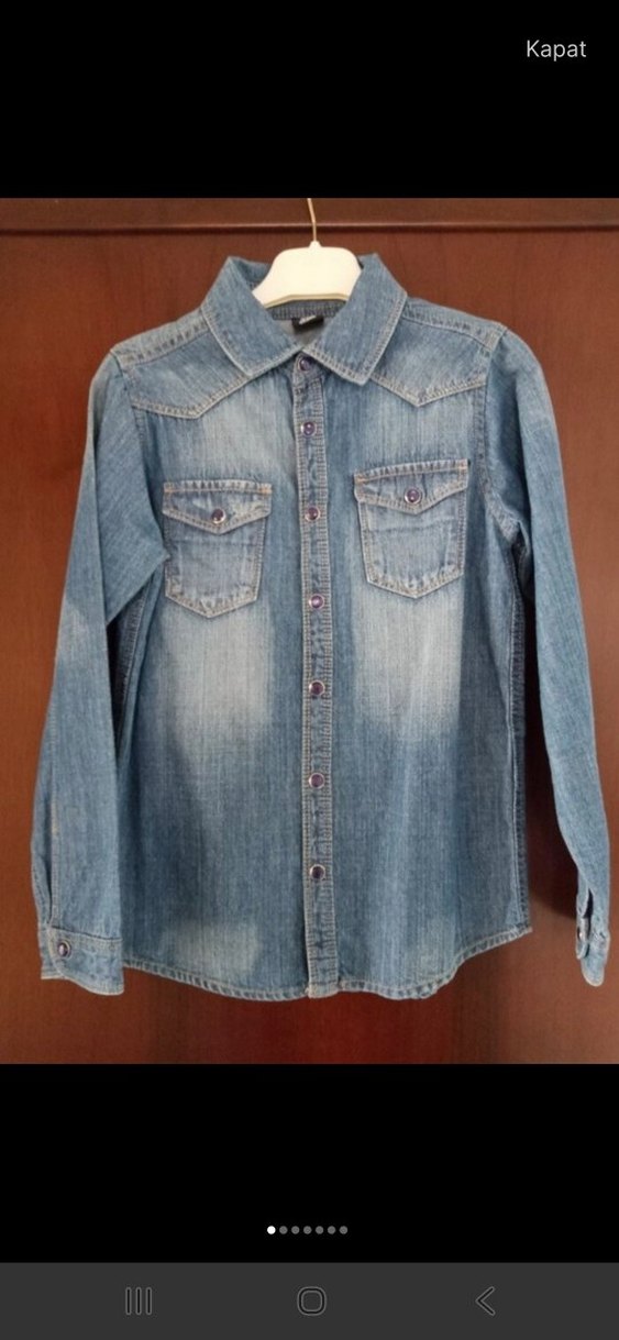 kiz çocuk için mavi denim gömlek, uzun kollu ve düğmeli. Notched lapel yakalı, regular fit tonlarda hafif batik desenli.