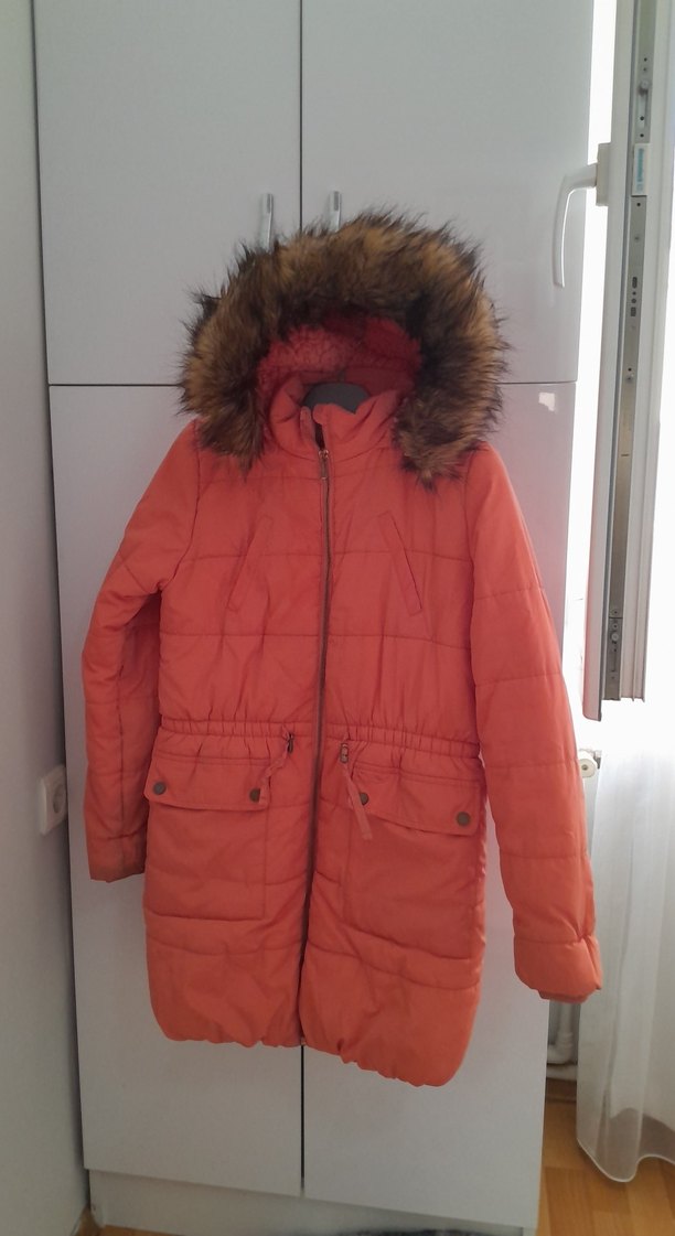 yavruağzu parlak renkte kışlık mont. Kapüşonunda kürk detayları ve notched lapel yaka bulunur. ince değildir.sayılı giyildi