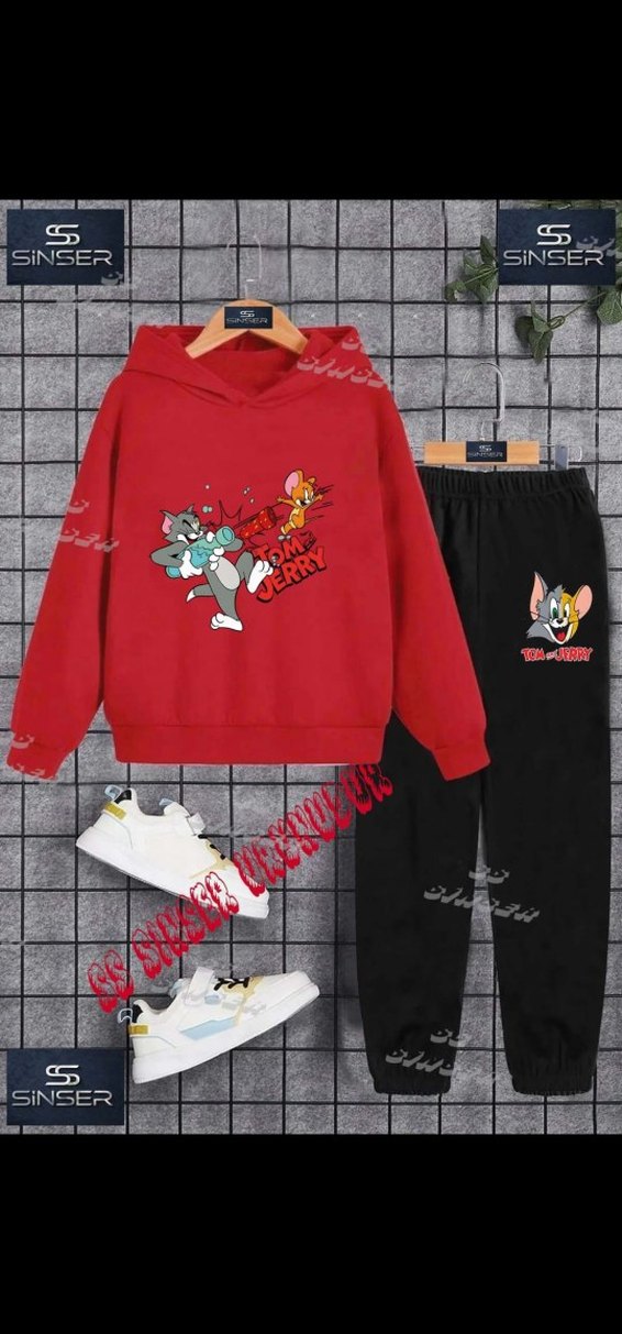 Kızgın Tom ve Jerry baskılı kırmızı kapüşonlu sweatshirt ve siyah örgü detaylı rahat kesim eşofman altından oluşan erkek çocuk takımı. Yumuşak ve sıcak kumaş kullanılmıştır.