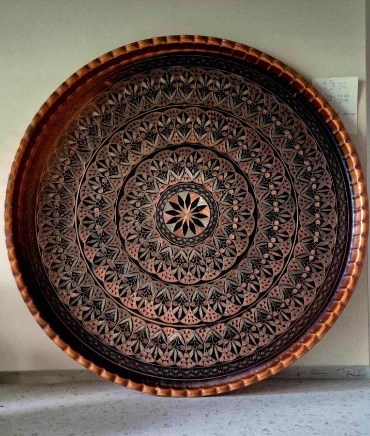 el işçiliğiyle yapılmış, detaylı çiçek desenlerine sahip Ev dekorasyonuna geleneksel bir dokunuş katar kalın malzeme el dövme ile tasarlanmış harika bir sini bu fiyata yok