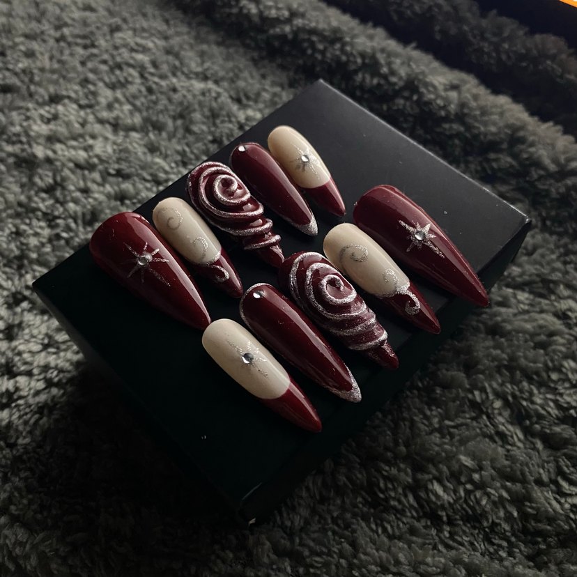 Koyu bordo renkte, 3D spiral desenli ve küçük taş detaylı tırnak süslemeleri. 10’lu set halindedir.