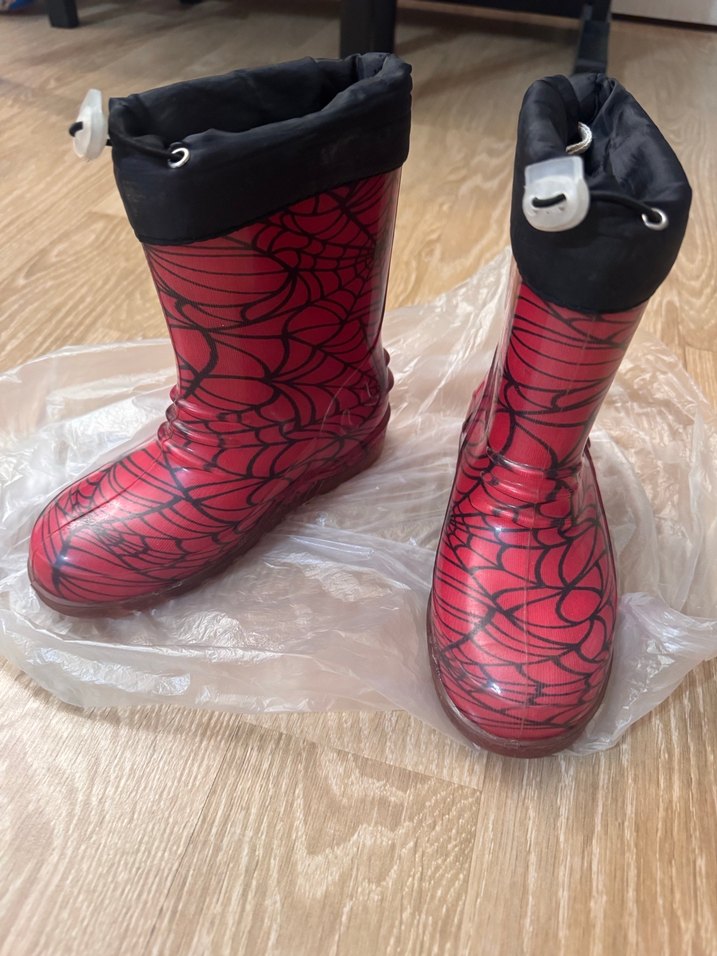 Kırmızı kauçuk malzemeden, siyah örümcek ağı desenli ve bağcıklı ayarlanabilir üst kısımlarıyla gotik tarzda renkli yağmur çizmesi.Az kullanılmış içi polarlı