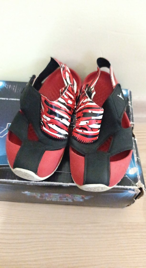 Kızıl siyah zebra desenli, ayarlanabilir cırt cırtlı erkek sandalet. Dayanıklı kauçuk malzemeden, modaya uygun sokak stili için uygun.
