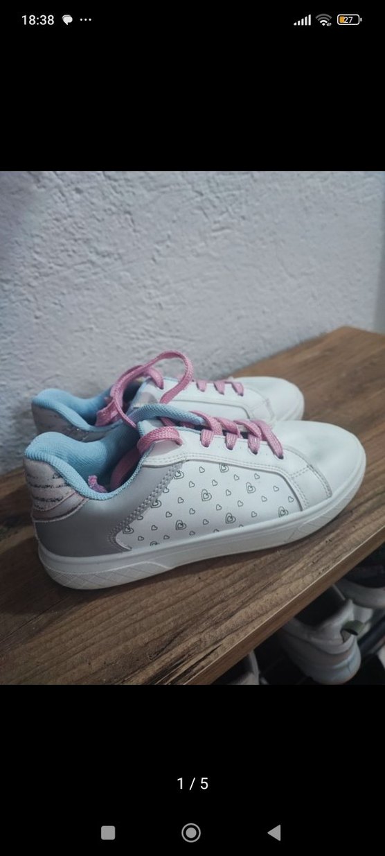 Beyaz kız spor ayakkabısı, pastel pembe bağcıklar ve kalp desenleri ile, rahat kauçuk tabanlı sokak stili için uygundur