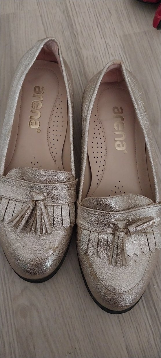 Altın renkli, parlak süet kız loaferları, püskül ve hafif yılan deseni ile. İç kısmında "arena" markası yazılı. dis kısımda kusurları mevcut resimde belirttim 2 defa giyilmistir