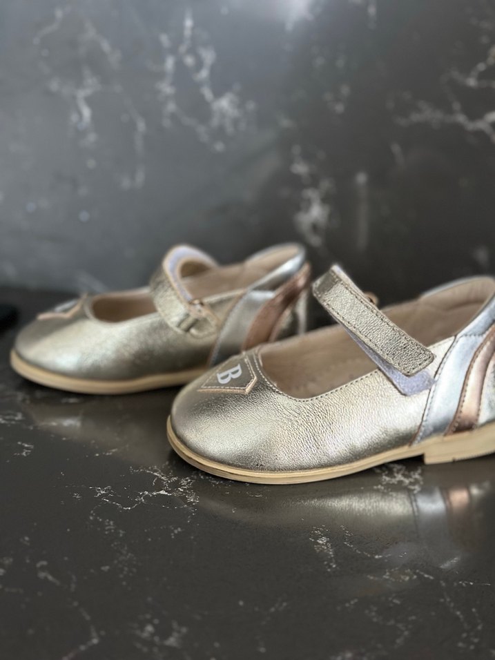 Altın renkli, tokalı kayış ve nakış detaylı kızlar için modern klasik bale ayakkabısı. Tabanı rahatlık sağlayan kauçuktandır.