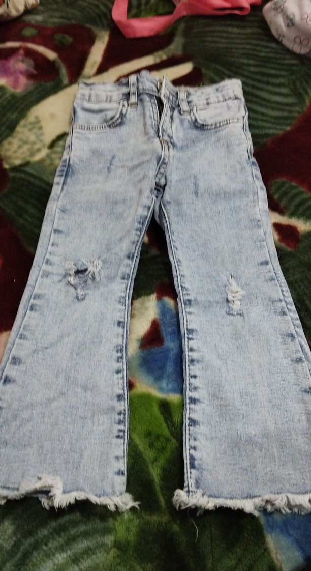 Kızlar için bol kesim, bağcıklı jean pantolon. Gri-mavi tonlarda batik desenli, sokak stiline uygun, yırtık detaylı pantolon.