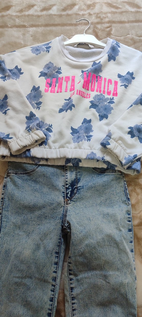 Bağlama desenli, uzun kollu, yuvarlak yaka ve düğmeli detaylı kız sweatshirtü. Pastel mavi çiçekli desen ve 'Santa Monica Los Angeles' yazısı bulunur. Denim görünümlü yumuşak kumaş.