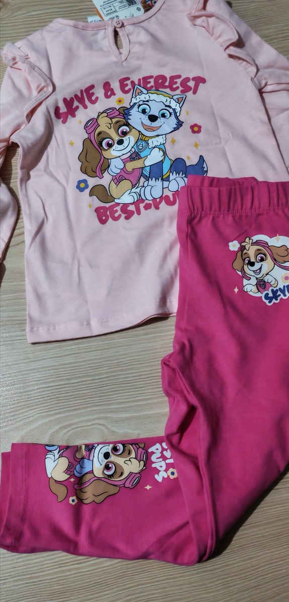 Kızlar için kollu, baskılı ve renkli desenli, yumuşak sentetik kumaştan yapılmış, fitted kesim takımı. Alt üst takım 4-5 yaş