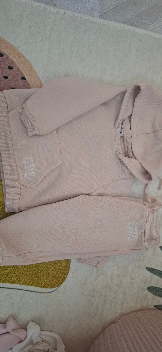 Kızlar için bol kesim, uzun kollu kapüşonlu bej sweatshirt ve eşofman takımı. Yumuşak kürk detayları ve pastel tonu ile günlük sokak giyimine uygun.