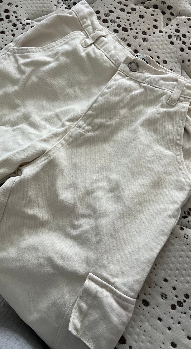 Kızlar için beyaz keten, desensiz, salaş kesim pantolon. Rahat ve basic, sokak stiline uygun.