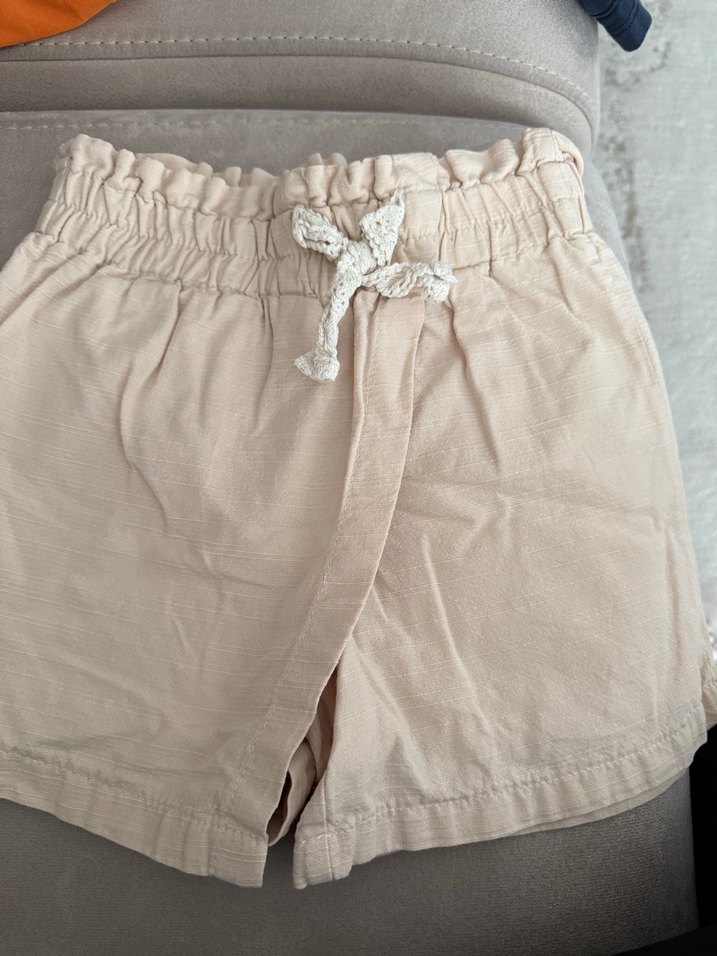 Kızlar için keten kumaştan, bel kemerli, bol kesim ve pastel tonlarda bej şort.