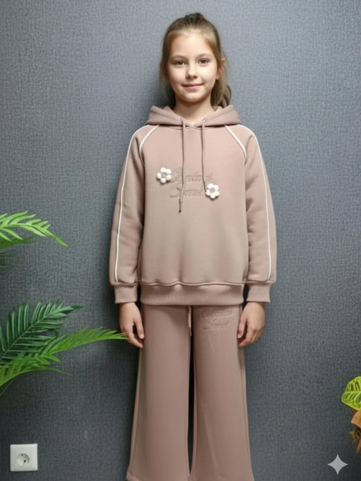 Kızlar için Bej Nakışlı Kapüşonlu Eşofman Takımı