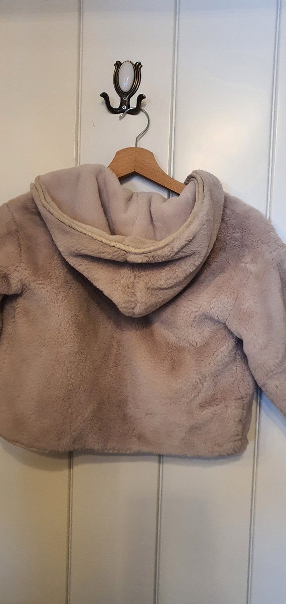 Kızlar için bej renkte, peluş kumaştan yapılmış, kapüşonlu ve bol kesim bir ceket. Düz ve sokak stiline uygun bir modeldir.
