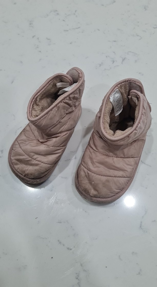 Kızlar için bej renkli, yumuşak iç astarlı ve tokalı sıcak terlikler. Rahatlık ve dayanıklılık için kauçuk tabanlıdır.