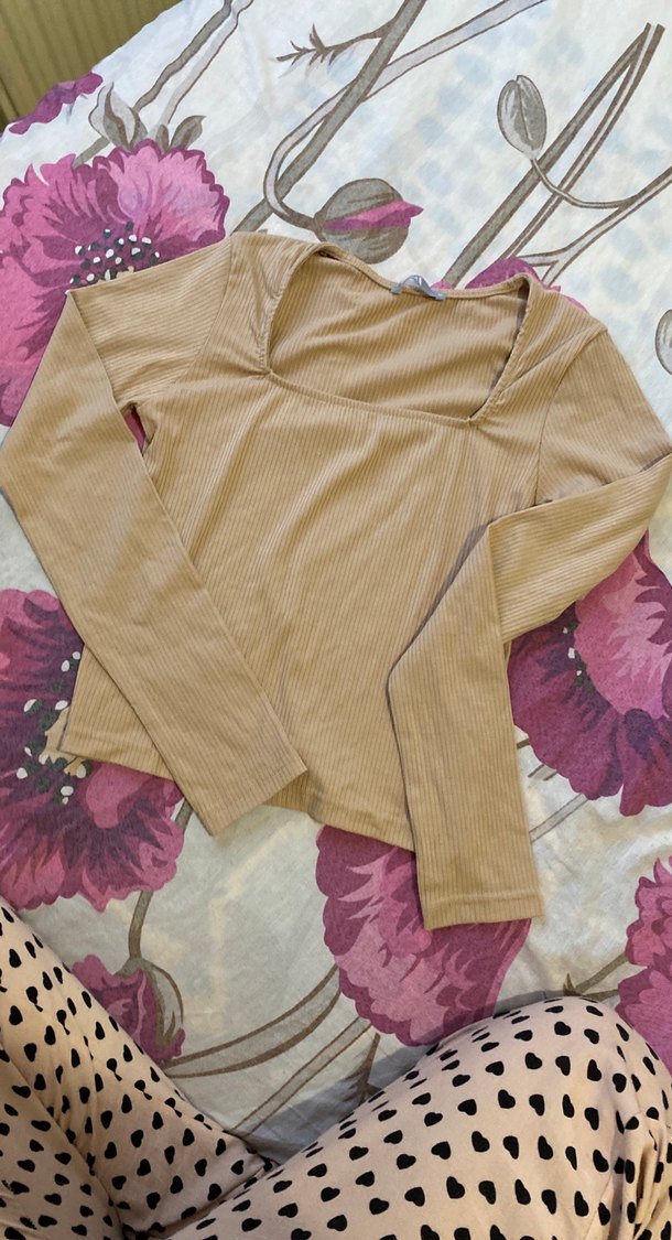 Bej renkli, uzun kollu ve dar kesim kız bluzu, tek renk ve kayık yaka ile rahat ve şık bir görünüm sunar.