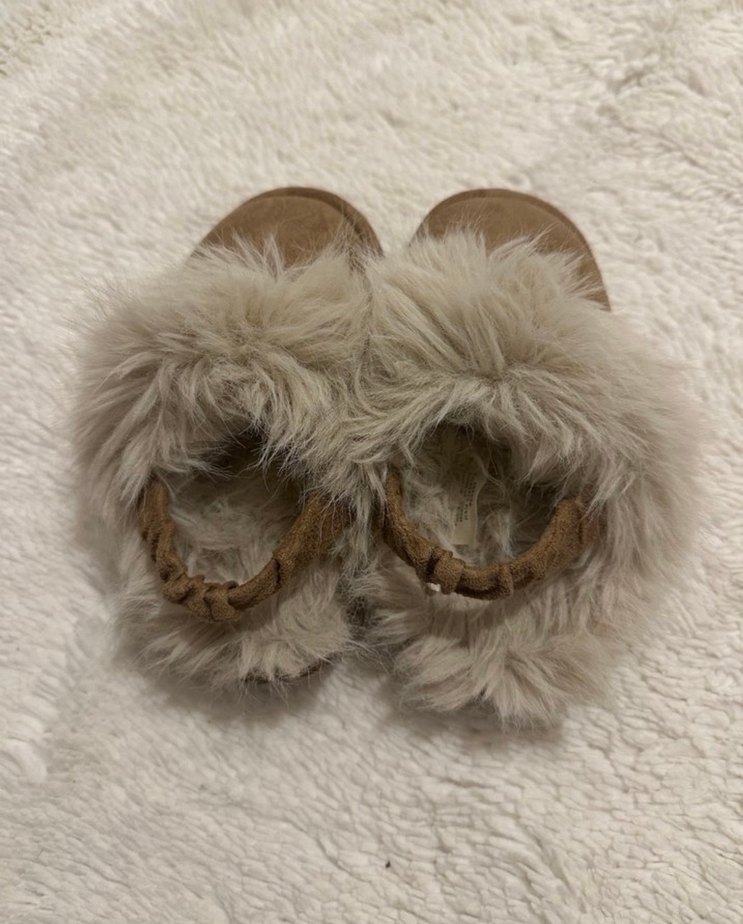 Kızlar için yün ve yumuşak kürk detaylı bej terlik. Bohem tarzına uygun, desen içermeyen rahat bir tasarım.