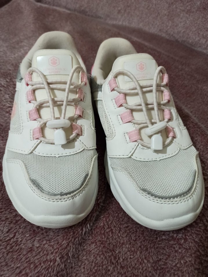 Beyaz ve pastel pembe detaylı, bağcıklı kız spor ayakkabısı. Kauçuk tabanlı, desen içermeyen sokak stili için uygun. Ürün sadece bir kere kullanıldı 28 numara ama makinada bir numara küçülmüştür