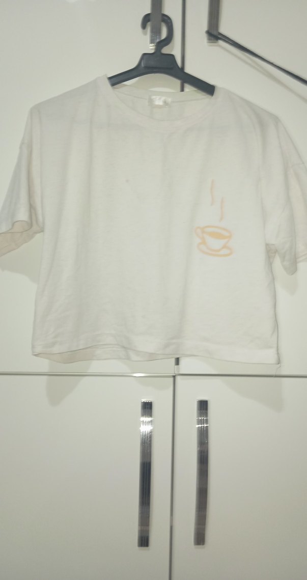 Pamuk kumaştan, rahat kesim beyaz kısa kollu kız tişörtü, yuvarlak yaka ve pastel baskılı desenle sokak stiline uygun. ☕