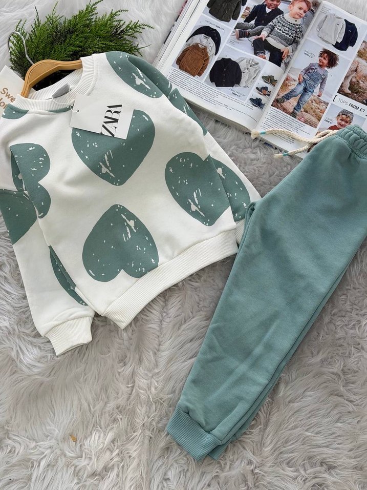 Kızlar için beyaz baskılı, yuvarlak yaka ve uzun kollu sweatshirt ile rahat kesim pastel yeşil eşofman. Sweatshirt üzerinde dantel detayı bulunur.