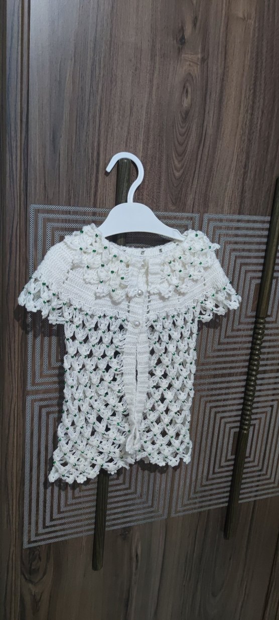 Kızlar için kısa kollu, dantel detaylı ve işlemeli desenlere sahip beyaz örgü hırka. Bol kesim ve bohem tarzda.