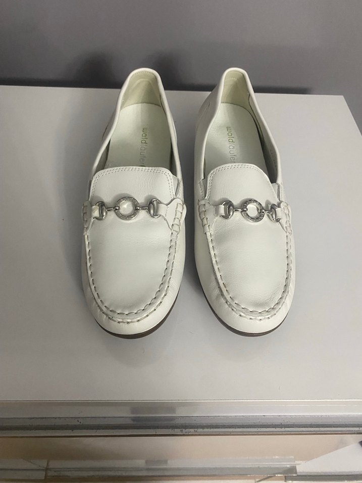Kızlar için beyaz deri loafer ayakkabılar, klasik tokalı tasarıma ve düz, desensiz yüzeye sahiptir. Zamansız normcore stil için uygundur.