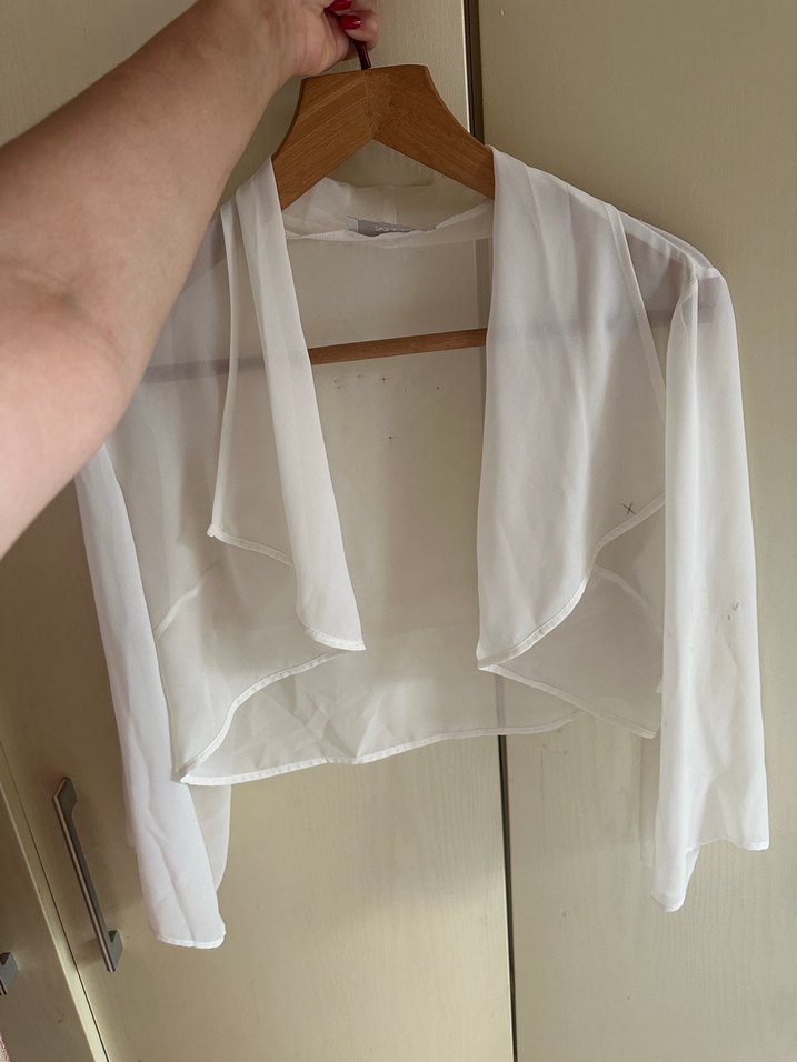 Beyaz, drapeli ve straplez yakalı, uzun kollu kızlar için fit kesim bolero. Hafif keten kumaştan üretilmiştir.