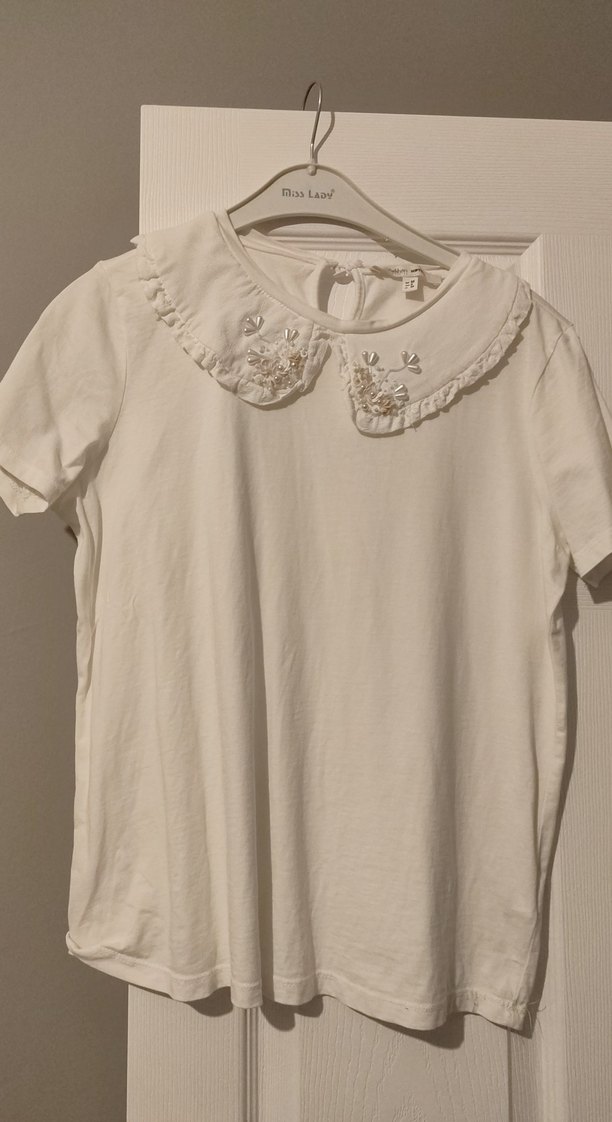 Beyaz, kısa kollu kız gömleği, fırfırlı yakası ve nakış detaylarıyla. Pamuklu, bol kesim kumaştan üretilmiş, rahat ve şık bir model.
