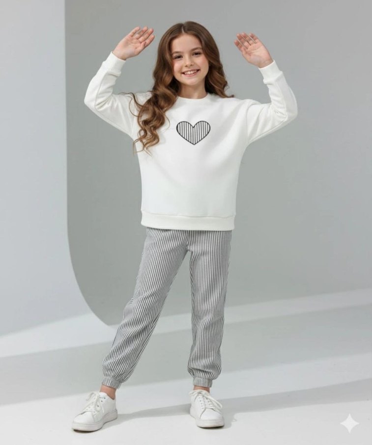 Yumuşak tüylü kumaştan, uzun kollu ve yuvarlak yaka, kalp baskılı beyaz sweatshirt ve gri çizgili bol kesim eşofman.