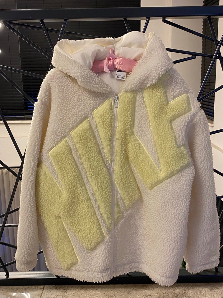 Çok iyi durumda orijinal Nike mont. Beyaz kapüşonlu, bol kesim peluş ceket. Pastel nakış detayları ve yumuşak kürk dokusu ile trend sokak stili için uygun.