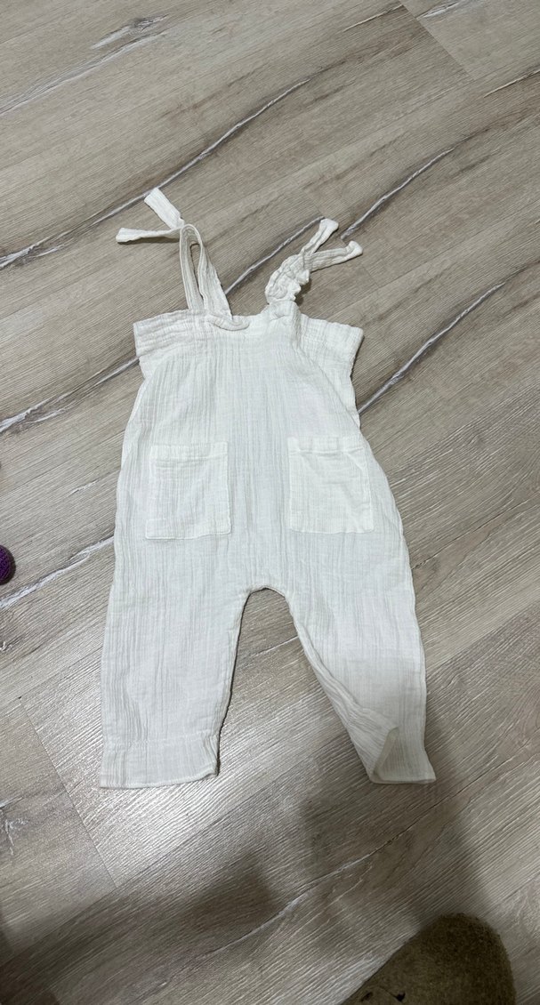 Keten kumaştan, askılı ve bol kesimli beyaz tulum. Önde iki cep bulunur, bohem tarzıyla rahat ve şık görünür.