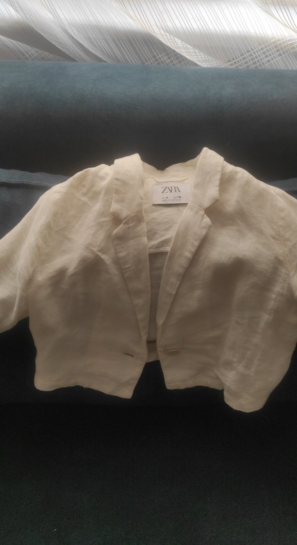 Uzun kollu, keten kumaştan yapılmış, düğmeli beyaz bolero. Gevşek kesimi ve kesik yaka detayı ile sokak modasına uygun.