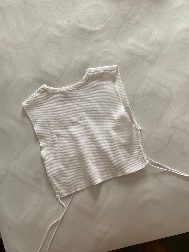 Yüksek yakalı, kolsuz, keten kumaştan yapılmış, pastel beyaz renkte, sade ve temel sokak stili kızlar için dar kesim yelek.