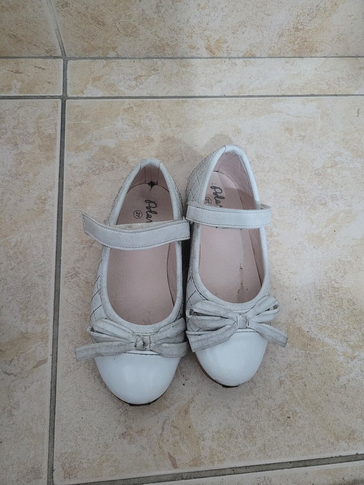 Beyaz renkli, kürk detaylı kızlar için modern klasik stile sahip, yumuşak kauçuk tabanlı babet ayakkabılar.