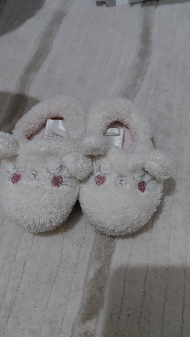 Kızlar için beyaz yumuşak kumaştan, kürklü detaylı ve nakışlı pastel desenlere sahip sıcak ev terlikleri.