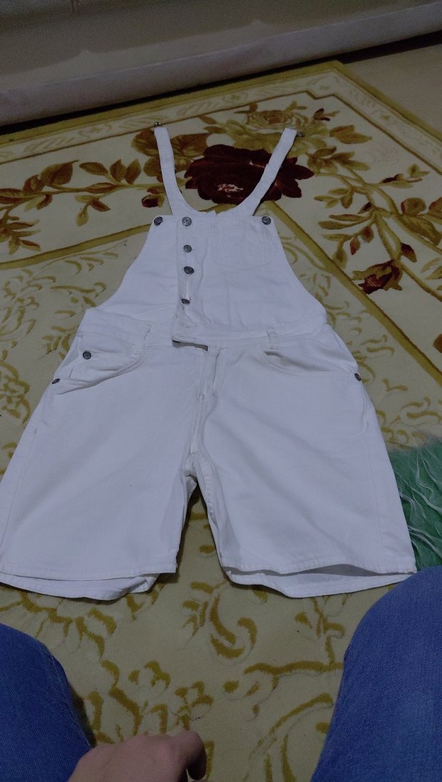 Düğmeli, askısız, pamuklu ve bol kesim beyaz kız tulumu. Sokak tarzına uygun sade tasarım. arka cep kısmında hafif sarılık var çamaşır suyu ile cıkarılabilir.