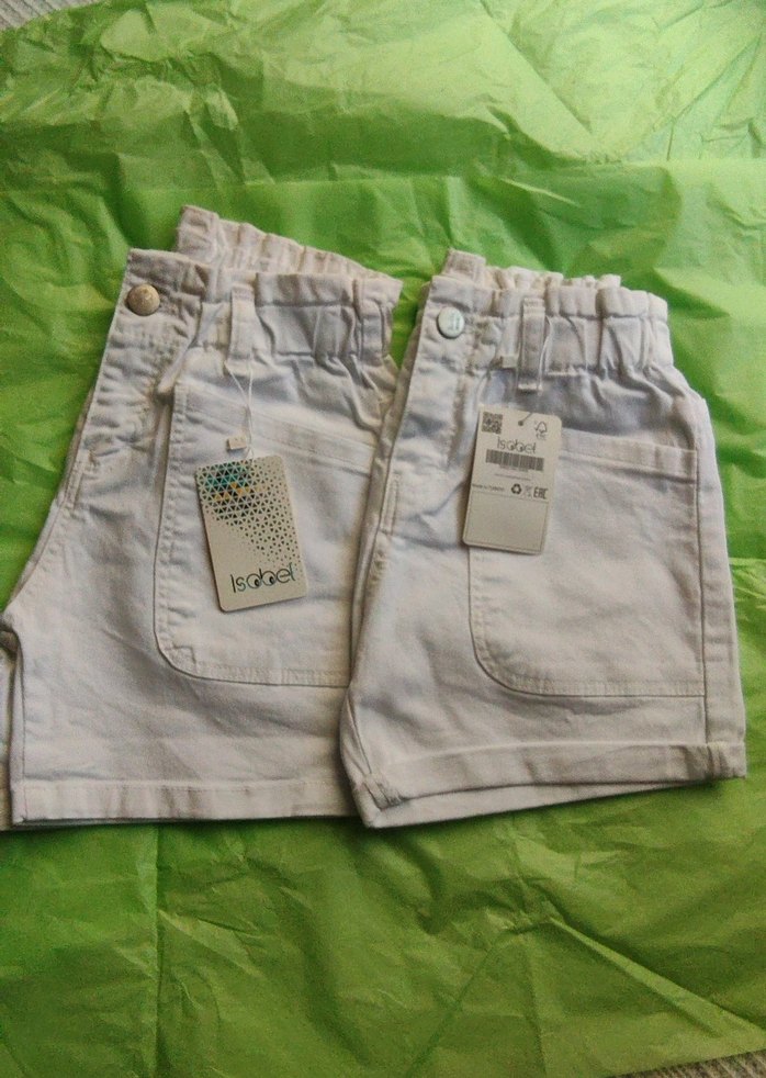 Kızlar için beyaz pamuklu, beli kemerli, KANVARS bol kesim şort. 4/5 YAS, 5/6 yaş mevcut