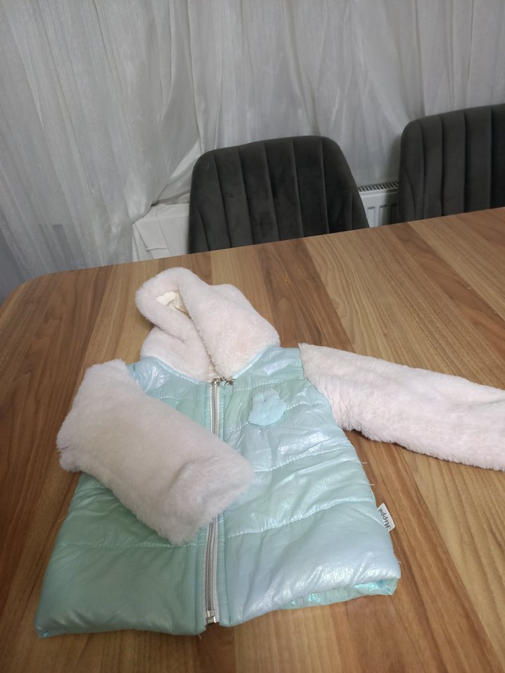 Kızlar için beyaz peluş detaylı kapüşonlu mont, pastel renkli ve fitted kesimle rahatlık sağlar. lekeler mevcut çıkabilir detaylı yıkama yapılırsa