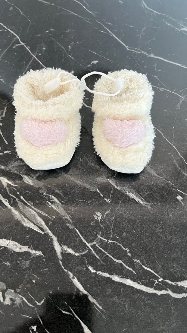 Hiç kullanılmadı Kızlar için yumuşak ve sıcak peluş terlikler, kürklü detaylara sahiptir. Beyaz renkli, pastel pembe nakışlı kalp desenleriyle sade ve rahat bir tasarım sunar.