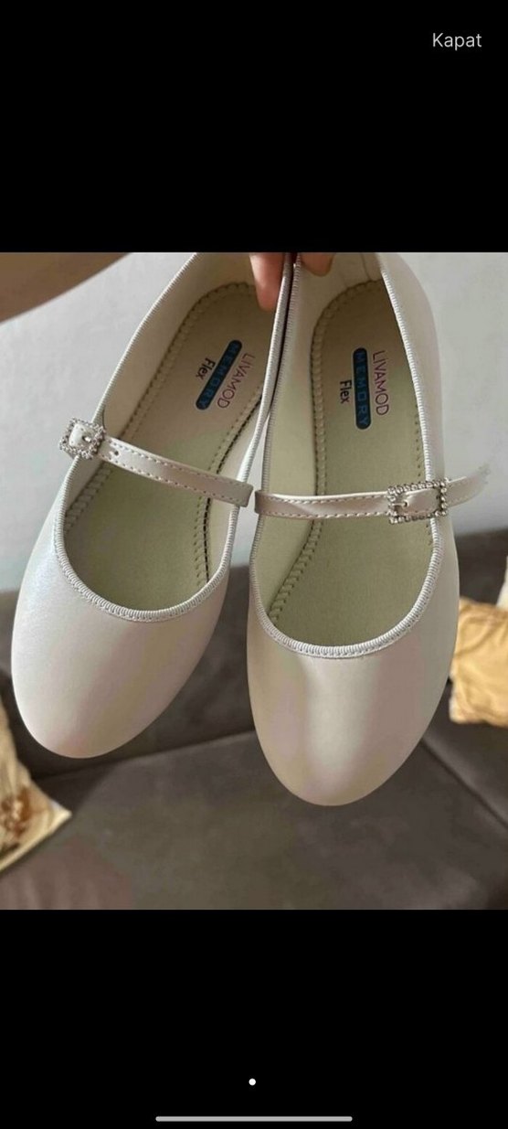 Klasik beyaz renkte, tokalı kayışlı, düz kauçuk malzemeden yapılmış kızlar için bale ayakkabısı. Desensiz, pastel tonlarda ve LIVAMOD markalıdır.